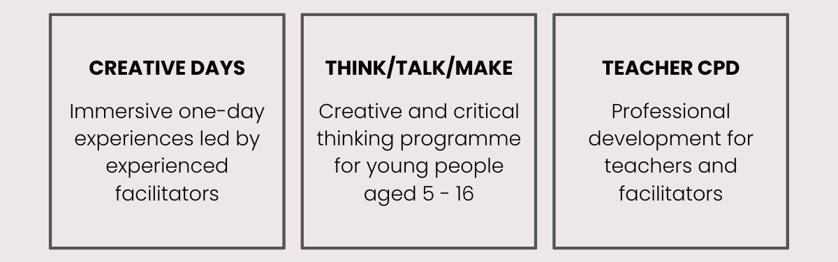 Our THINK/TALK/MAKE programme is a creative and critical thinking programme tailored for children and young people aged 5 to 16, in addition to supporting and upskilling staff.